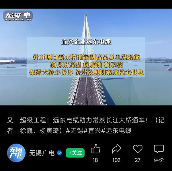 在常人眼中,電纜或許只是一根能通電的線,但在常泰長(zhǎng)江大橋這樣的工程中,它的要求卻近乎苛刻。大橋橫跨長(zhǎng)江,地處開闊水域,常年面臨強(qiáng)風(fēng)、高濕與溫差變化等多重挑戰(zhàn),對(duì)電力供應(yīng)系統(tǒng)的安全性、耐久性和穩(wěn)定性提出了極高標(biāo)準(zhǔn)。遠(yuǎn)東電纜為其精心打造的高性能電纜系統(tǒng),采用特種材料與強(qiáng)化結(jié)構(gòu)設(shè)計(jì),具備卓越的耐候性、抗腐蝕性和機(jī)械強(qiáng)度,即便在極端天氣與長(zhǎng)期微幅振動(dòng)環(huán)境下,仍能保障主橋體、索塔、照明及智能監(jiān)測(cè)系統(tǒng)的不間斷供電。在大橋服務(wù)區(qū)綜合樓建設(shè)中,遠(yuǎn)東提供的低煙無(wú)鹵型電纜具備優(yōu)異的阻燃性能,其環(huán)保材質(zhì)杜絕了有害物質(zhì)釋放,既符合綠色建筑標(biāo)準(zhǔn),也為往來(lái)旅客營(yíng)造出更舒適、安心的休憩環(huán)境。
